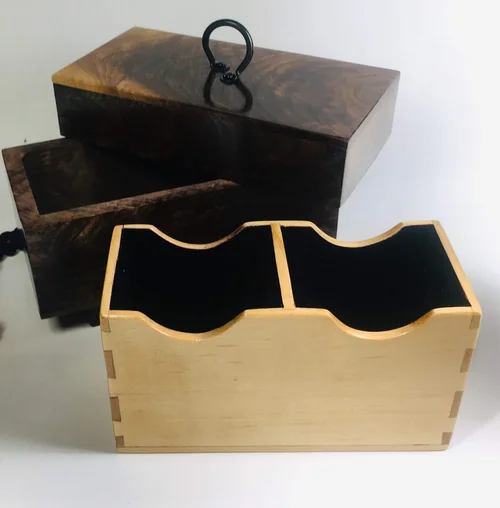 This small tea box was a Christmas gift. The outside box is made from highly figured Claro Walnut. The interior is made from spalted maple and provides a nice contrast when the box is opened. The red center clasp is a monkey fist knot held by a cobra weave loop and a hemp lashing.